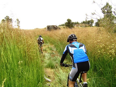 Voltanto aos trilhos, estes desenvolviam-se num misto de pinhal, eucaliptal (pouco, graças a Deus), terrenos agricolas com a ervinha que nos chegava aos joelhos e alguns singletracks. Como já disse, muito engraçado e sem dificuldades fisicas ou técnicas de maior.